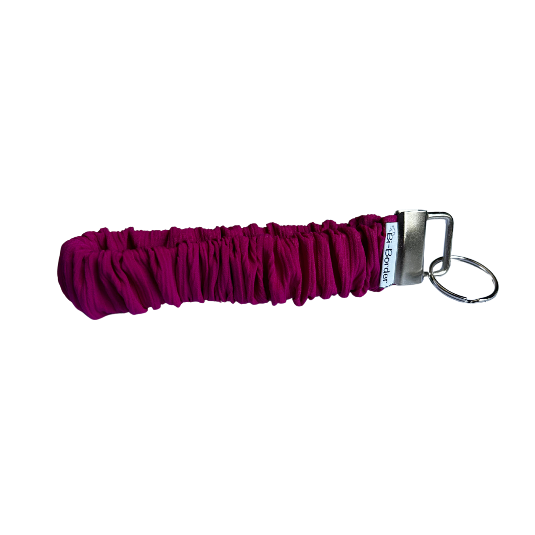 This scrunchie keychain is made to hold your keys and all the accessories while maintaining its shape. It will not stretch out due to weight and it will stay securely on your wrist. Its also much easier to find your keys when you are searching for your scrunchie keychain.